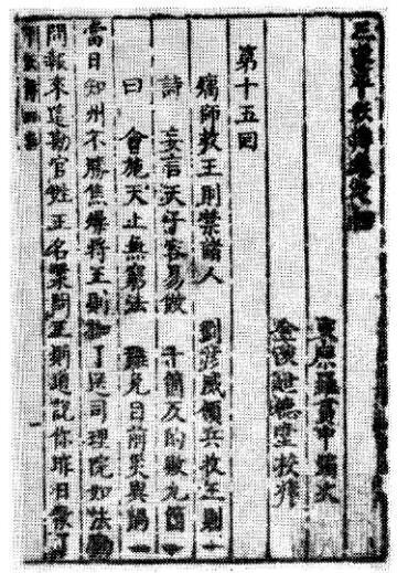 ↑第十五回回首,题“东原罗贯中编次,金陵世德堂校梓。”