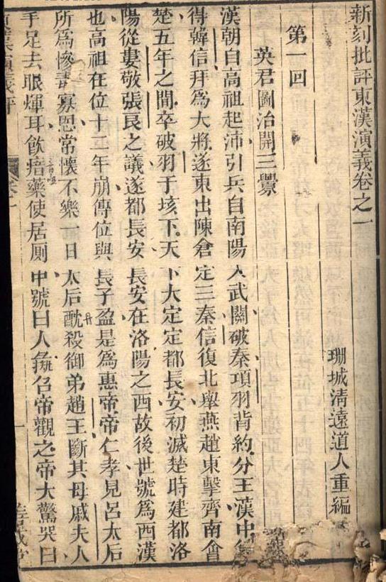 东汉演义,8卷32回,清同治善成堂本,题“珊城清远道人重编”。前有序,题“岁在旃蒙大渊献竹秋,清远道人书”。“旃蒙大渊献竹秋”,即乙亥年 (1755,乾隆二十年)二月。 此书是清代珊城清远道人根据明代谢诏《东汉演义传》重编。 《东汉演义传》故事多取自民间传说,谢诏编时又加许多想象,故与史实相差甚远,叙述也过于简略。清远道人深感《西汉演义传》、《东汉演义传》虚实之差,遂本史鉴之法重编了《东汉演义》。清远道人之重编本,较符合历史,但不足之处是缺乏演义的想象力和文学性,文字大量截取自正史。 自清远道人重编后,嘉庆同文堂本、同治善成堂本《东西汉演义》,均是将甄伟《西汉演义》与清远道人重编《东汉演义》合刊在一起。 本书主要讲述西汉末年王莽篡位后,汉太子刘秀率领三十六员云台大将兴兵讨莽,攻关斩将,恢复汉室天下的故事。西汉王朝末年,皇帝年幼,外戚干政,安汉公王莽独揽大权。后又害死汉平帝刘衎篡位称帝,使民心动荡不安,各诸侯混战,一时天下大乱……