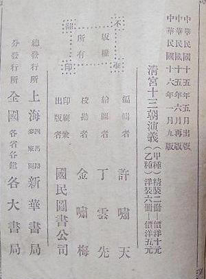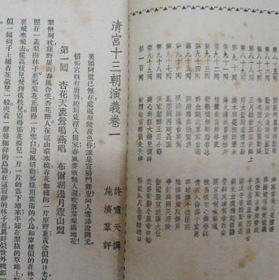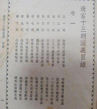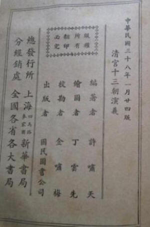 《清宫十三朝演义》民国15年出版,100回。精装2册定价10元;洋装(平装)6册,外赠彩印《清宫艳影图》1册,定价5元。这种插图改赠图册的形式,现在看来,仍很新颖!