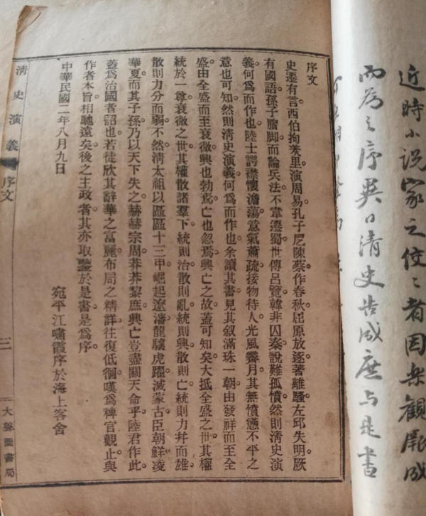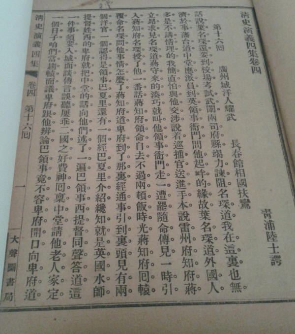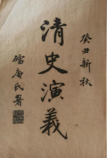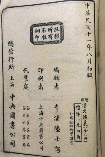 清史演义,140回,题青浦陆士谔著。大声图书局民国2年(1913年)初集出版。每集4卷20回。此书网上多称《清朝秘史》、《清代野史》,又称《清代君臣演义》 ,当是书商更名。 叙述了爱新觉罗氏自祖先发祥于北方长白,通过征战逐渐发展壮大,以至入主中原,建立了中国社会最后一个封建王朝一清,直至宣统逊位的历史。描绘了这一历史时期发生的一系列遗闻轶事,及展现了皇室中的种种错综复杂的人际关系。本书史料扎实,叙述较平实。 此书写作时民国尚“年费四百万金供养”清皇室,书中叙述多以清室为正统;与他书不同的是,称历代皇帝多用庙号,不像一般通俗小说称康熙乾隆。 ![]() 陆士谔(1878-1944),江苏青浦人,生于千年古镇珠溪镇。名守先,字云翔,号士谔,亦号云间龙、沁梅子等。 17岁时,从名医唐纯斋学医,1905年27岁来沪行医谋生,翌年便以“沁梅子”出版了《精禽填海记》,1908年又以同一署名出版《鬼国史》。此后他一边行医(曾获得上海十大名医的称号),一边以惊人的速度写作小说。 据《云间珠溪陆氏谱牒》陆士谔小传云:“精于医,负文名,著有《医学指南》、《加评温病条辨》等医书十余种,《清史》、《剑侠》等说部百余种,《蕉窗雨话》等笔记二三种行世。” 主要作品有《清史演义》、《八大剑侠传》、《血滴子》、《新中国》、《新上海》、《蕉窗雨话》等。