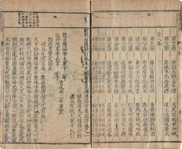 《唐书演义》,书林熊子钟谷编集。书成以视余,逐首末阅之,似有紊乱《通鉴纲目》之非。人或曰:“若然,则是书不足以行世矣。” 余又曰:“虽出其一臆之见,于坊间《三国志》、《水浒传》相仿,未必无可取。且词话中诗词檄书颇据文理,使俗人骚客披之,自亦得诸欢慕,岂以其全廖而忽之耶?惜乎全文有欠历年实迹,未克显明其事实,致善观是书者见哂焉。或人诺吾言而退,余曰:“使再会熊子,虽以历年事实告之,使其勤渠于斯,迄于五代而止,诚所幸矣。” 因援笔识之,以俟知者。 时龙飞癸丑年仲秋朔旦 江南散人李大年识 书林杨氏清堂刊 往自前后汉、魏、吴、蜀、唐、宋,咸有正史,其事文载之不啻详矣。后是则有演义。演义以通欲为义也者,故今流俗即目不挂司马、班、陈一字,然皆能道赤帝,诧司马、悲伏龙、凭曹瞒者,则演义之为耳。演义固喻俗书哉。义意远矣。 唐创业高祖,然高祖正自木强,是固太宗之发纵,化家为国,则封秦时居多,故俗多言小秦王者,为太宗也。嗟嗟!唐去今几时,然扼腕向慕,即秦裂眦指发,即齐即太子建成,况当时乎?而欲与秦争,此真无异奋其螳臂以当,若爵喙往成啜耳。 嗟嗟!太宗用兵,即当时李、魏诸臣不过论治;即当时房、杜诸臣,不过赋诗染翰。即古之帝王,未有布衣掺觚之士不能往,固尝啧啧叹之。新旧《书》备尔矣。载揽演义,亦颇能得意,独其文词时传正史,于流俗或不尽通。其事实时彩谲诳,于正史或不尽合。因略缀拾其额,为演义题评,亦怂慂光禄之志。书成叙之。吁嗟欷!正史余尝涉矣。偃蹇餬口,莫之尽其涯涘。稗官小说,既雅非其好,而然献其万舞又强颜说耶?西方美人余于太宗与?何遐思也! 癸巳阳月,书之尺蠖斋中