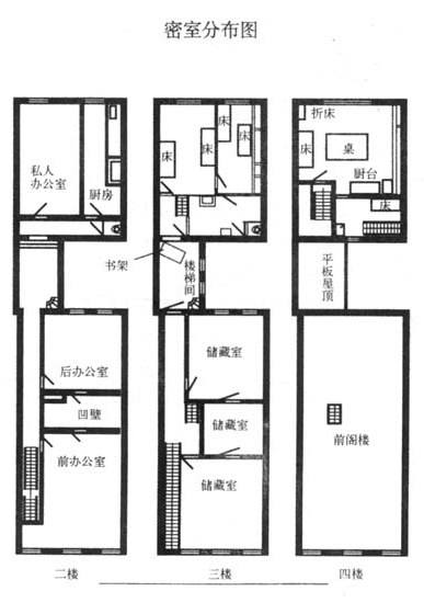 我来说说这幢大楼吧。底层有个大储藏室作仓库用。大屋的前门紧挨着储藏室的门,进了前门是一小截过道通向楼梯(A)。楼梯顶部还有一扇门,门上镶着毛玻璃,玻璃上写有黑色的“办公室“字样。这就是最大的那间主办公室,很大,很亮,东西很齐全。爱丽、梅爱朴和库菲尔斯先生白天就在这儿上班。一间昏暗的小房间,里面有保险箱、衣橱和一个大立柜,由此通向一间小一点的、也有点昏暗的办公室。过去克莱勒先生和凡·达恩先生就坐在这里。现在只有克莱勒先生了。要想到克莱勒的办公室只能走外面的过道,而且只能通过一扇从里面打开的玻璃门进去,从外面是不太容易的。