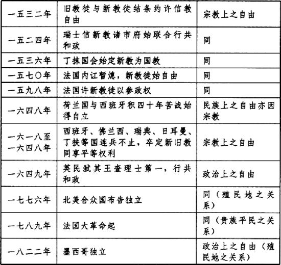 “不自由毋宁死!”斯语也,实十八九两世纪中,欧美诸国民所以立国之本原也。自由之义,适用于今日之中国乎?曰:自由者,天下之公理,人生之要具,无往而不适用者也。虽然,有真自由,有伪自由,有全自由,有偏自由,有文明之自由,有野蛮之自由。今日自由云自由云之语,已渐成青年辈之口头禅矣。新民子曰:我国民如欲永享完全文明真自由之福也,不可不先知自由之为物果何如矣。请论自由。 自由者,奴隶之对待也。综观欧、美自由发达史,其所争者不出四端:一曰政治上之自由,二曰宗教上之自由,三曰民族上之自由,四曰生计上之自由(即日本所谓经济上自由)。政治上之自由者,人民对于政府而保其自由也。宗教上之自由者,教徒对于教会而保其自由也。民族上之自由者,本国对于外国而保其自由也。生计上之自由者,资本家与劳力者相互而保其自由也。而政治上之自由,复分为三:一曰平民对于贵族而保其自由,二曰国民全体对于政府而保其自由,三曰殖民地对于母国而保其自由是也。自由之征诸实行者,不外是矣。 以此精神,其所造出之结果,厥有六端:(一)四民平等问题:凡一国之中,无论何人不许有特权(特别之权利与齐民异者),是平民对于贵族所争得之自由也。(二)参政权问题:凡生息于一国中者,苟及岁而即有公民之资格,可以参与一国政事,是国民全体对于政府所争得之自由也。(三)属地自治问题:凡人民自殖于他土者,得任意自建政府,与其在本国时所享之权利相等,是殖民地对于母国所争得之自由也。(四)信仰问题:人民欲信何教,悉由自择,政府不得以国教束缚干涉之,是教徒对于教会所争得之自由也。(五)民族建国问题:一国之人,聚族而居,自立自治,不许他国若他族握其主权,并不许干涉其毫末之内治,侵夺其尺寸之土地,是本国人对于外国所争得之自由也。(六)工群问题(日本谓之劳动问题或社会问题):凡劳力者,自食其力,地主与资本家,不得以奴隶畜之,是贫民对于素封者所争得之自由也。试通览近世三四百年之史记,其智者敝口舌于庙堂,其勇者涂肝脑于原野,前者仆,后者兴,屡败而不悔,弗获而不措者,其所争岂不以此数端耶?其所得岂不在此数端耶?试一述其崖略: 昔在希腊罗马之初政,凡百设施,谋及庶人。共和自治之制,发达盖古。然希腊纯然贵族政体,所谓公民者,不过国民中一小部分,而其余农、工、商及奴隶,非能一视也。罗马所谓公民,不过其都会中之拉丁民族,而其攻取所得之属地也,非能一视也。故政治上之自由,虽远滥觞于希、罗,然贵族之对平民也,母国之对属地也,本国人之对外国也,地主之对劳力者也,其种种侵夺自由之弊,亦自古然矣。及耶稣教兴,罗马帝国立,而宗教专制、政治专制乃大起。中世之始,蛮族猖披,文化蹂躏,不待言矣。及其末也,则罗马皇帝与罗马教皇,分司全欧人民之躯壳、灵魂两界,生息于肘下而不能自拔。故中世史者,实泰西之黑暗时代也。及十四五世纪以来,马丁·路得兴,一抉旧教藩篱,思想自由之门开,而新天地始出现矣。尔后二三百年中,列国或内争,或外伐,原野餍肉,谿谷填血,天日惨淡,神鬼苍黄,皆为此一事而已。此为争宗教自由时代。及十七世纪,格林威尔起于英;十八世纪,华盛顿兴于美;未几而法国大革命起,狂风怒潮,震撼全欧。列国继之,云滃水涌,遂使地中海以西,亘于太平洋东岸,无一不为立宪之国;加拿大、澳洲诸殖民地,无一不为自治之政,直至今日,而其机未止。此为争政治自由时代。自十六世纪,荷兰人求脱西班牙之轭,奋战四十余年,其后诸国踵兴,至十九世纪,而民族主义磅礴于大地。伊大利、匈加利之于奥大利,爱尔兰之于英伦,波兰之于俄、普、奥三国,巴干半岛诸国之于土耳其,以至现今波亚之于英,菲律宾之于美,所以死亡相踵而不悔者,皆曰“非我种族不得有我主权”而已。虽其所向之目的,或达或不达,而其精神一也。此为争民族自由时代。(民族自由与否,大半原于政治,故此二者其界限常相混。)前世纪(十九)以来,美国布禁奴之令,俄国废农佣之制,生计界大受影响。而廿卅年来,同盟罢工之事,所在纷起,工厂条例,陆续发布,自今以往,此问题遂将为全地球第一大案。此为争生计自由时代。凡此诸端,皆泰西四百年来改革进步之大端,而其所欲以去者,亦十之八九矣。噫嘻!是遵何道哉?皆“不自由毋宁死”之一语,耸动之,鼓舞之,出诸壤而升诸霄,生其死而肉其骨也。於戏!璀璨哉,自由之花!於戏!庄严哉,自由之神! 今将近世史中争自由之大事,列一年表如下: ![]() ![]() ![]() 由此观之,数百年来世界之大事,何一非以“自由”二字为之原动力者耶?彼民之求此自由也,其时不同,其国不同,其所需之种类不同,故其所求者亦往往不同,要其用诸实事而非虚谈,施诸公敌而非私利一也。试以前所列之六大问题,复按诸中国,其第一条四民平等问题,中国无有也,以吾自战国以来,即废世卿之制,而阶级陋习,早已消灭也。其第三条属地自治问题,中国无有也,以其无殖民地于境外也。其第四条信仰问题,中国更无有也,以吾国非宗教国,数千年无教争也。其第六条工群问题,他日或有之,而今则尚无有也,以其生计界尚沈滞,而竞争不剧烈也。然则今日吾中国所最急者,唯第二之参政问题,与第四之民族建国问题而已。此二者事本同源,苟得其乙,则甲不求而自来;苟得其甲,则乙虽弗获犹无害也。若是夫吾侪之所谓自由,与其所以求自由之道,可以见矣