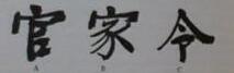 “官”和“家”这两个字的顶部“宀”,是汉字的部首,有“屋顶”的意思。注意其中间的凹陷,与得自中式屋顶的笔意。“令”字的顶部是一个“人”字,不过很像屋顶的外廓线。也请注意笔画向下撇的气势和收尾时向上翘曲的样子。