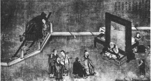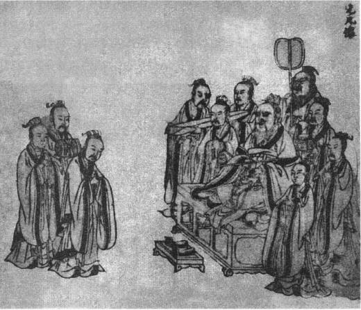 二 在这些先秦哲学家中,最先出来的是老子。老子姓李,名耳,字聃(据《史记》),楚国人。关于他的神话甚多,有的说他活了二百余岁,有的说他出关仙去。于是更有《老子化胡经》、《老子七十二变化图》之作。道家也以他为他们的宗教的始祖。于是他便成了与释迦牟尼的三身如来佛相配当的“三清”(即所谓“老子一无化三清”)。孔子曾与他相见过。因为他做过周守藏室之吏,所以孔子向他问礼。大约他的生活时代与孔子相差不远,其生当在公元前470年(周元王时)以前。老子所代表的思想是消极的,厌世的。他的书有《道德经》上下二篇,共八十一章,文字极简直。他因为当时政治的龌龊,言治者纷然出,而天下愈扰,于是主张无为,主张无治,以为“不尚贤,使民不争,不贵难得之货,使民不为盗,不见可欲,使民心不乱。是以圣人之治,常使民无治无欲”。鸡犬之声相闻,而民至老死不相往来,这就是他的理想国的景象。他不主张法治,以为:“民不畏死,奈何以死惧之!”他不喜欢贤能与强力,而以谦下与柔弱为至德。他说:“江海所以能为百谷王者,以善下之,故能为百谷王。”又说:“天下莫柔弱于水,而攻坚强者,莫之能胜,其无以易之。”他的悲观,极为彻透。他说:“天地不仁,以万物为刍狗;圣人不仁,以百姓为刍狗。”这种悲观的消极的思想,在当时极为流行;一部分的人,以生为苦,于是唱着:“知我如此,不如无生”,一部分的人则流于玩世不恭,讥笑一切仆仆道路的以救民救世为己任的人,如《论语》中所载长沮、桀溺诸人都是。老子便是他们的代表。 ![]() 老子像 ![]() 孔子问礼老聃图 ![]() 孔子像 ![]() 孔子凭几像 此为今日所见刻本中孔子像之最古者。与坊间习见之孔子像,颇不相同。选自明弘治本《阙里志》(西谛藏) 因为这一派厌世的消极的思想的流行,于是孔子便起来反抗他们,宣传尧、舜、文、武之治,努力维持理想中的传统的政治的与社会的道德,以中庸的积极的态度,始终不懈的从事于改良当时的政治,以复于他所理想的古代清明的政治状况。他在当时的影响极大。跟从他学习的有三千多人,主要的弟子有七十余人。他名丘,字仲尼,鲁国人(孔子见《史记》卷四十七)。生于公元前551年(即周灵王二十一年),卒于公元前479年(即周敬王四十一年)。他的事迹与言论,许多书上都有记载,但以《论语》所记者为最可靠。他曾做过鲁国的司空及司寇。后来去官周游列国。到了六十八岁时,复回鲁地。专心著述,编订《尚书》、《诗经》、《周易》,及《春秋》,还订定了《礼》与《乐》。卒时,年七十三。孔子的思想,是入世的,是积极的。《论语》虽为曾子的门人所记,文字虽极简朴直捷,却能把孔子的积极的思想完全表现出。老子主张无治无为,孔子则主张有为,主张政刑与德礼为治世者所必要。他说:“道之以政,齐之以刑,民免而无耻。道之以德,齐之以礼,有耻且格。”孔子是极力欲维持理想中的道德的。所以齐陈恒杀其君,孔子三日斋而请伐齐。季氏舞八佾于庭,孔子说道:“是可忍也,孰不可忍也!”当时的人常讥嘲孔子之仆仆道路,而无所成。但孔子则不悲观。“楚狂接舆歌而过孔子曰:‘凤兮,凤兮!何德之衰!往者不可谏,来者犹可追。已而已而,今之从政者殆而。’孔子下,欲与之言,趋而辟之,不得与之言。长沮、桀溺耦而耕,孔子过之,使子路问津焉。长沮曰:‘夫执舆者为谁?’子路曰:‘为孔丘。’曰:‘是鲁孔丘欤?’曰:‘是也。’曰:‘是知津矣!’问于桀溺。曰:‘子为谁?’曰:‘为仲由。’曰:‘是鲁孔丘之徒欤?’对曰:‘然。’曰:‘滔滔者天下皆是也,而谁以易之!且而与其从辟人之士也,岂若从辟世之士哉。’耰而不辍。子路行以告。夫子怃然曰:‘鸟兽不可与同群。吾非斯人之徒与而谁与!天下有道,丘不与易也!’”(《论语·微子》)这种精神,真足以感动一切时代的人! 较孔子略后,而与孔子具有同样的积极的救世的精神者为墨子。墨子主张博爱,非攻。他的势力,在当时也极大。老、孔、墨三派的思想,几乎三分天下。墨子名翟,或以他为宋人,或以他为鲁人。他的生活时代约在公元前500年(周敬王时)到公元前416年(周威烈王时)之间。关于墨子的书,有《墨子》五十三篇。但未必为墨子所自著。一部分是墨者记述墨子的学说与行事的,一部分是后人加入的。墨子有孔子的积极救世的精神,其救助被损害之国的热情,且较儒者尤为强烈。孟子的“墨子兼爱,摩顶放踵利天下,为之”数语,即足表现他的精神。楚国使公输般造云梯欲攻宋。墨子走了十日十夜,赶去见公输般,说服了他,使他中止攻宋。但同时,他与儒家有好几点相反对。儒者主张王者之师,并不反对战争。墨子则彻底的主张非攻。儒者主张爱有等次。墨子则主张博爱。儒者不信鬼而信天命,重礼乐,重视丧葬之事。墨子则主张明鬼而非命,提倡节葬而非乐。 儒、道、墨三派,各有其信徒。然他们的学说传世既久,便又起了分化。韩非子在《显学篇》里,将儒、墨二家的分化,说得非常详细。他说:“自孔子之死也,有子张之儒,有子思之儒,有颜氏之儒,有孟子之儒,有漆雕氏之儒,有仲良氏之儒,有孙氏之儒,有乐正氏之儒。自墨子之死也,有相里氏之墨,有相夫氏之墨,有邓陵氏之墨。故孔、墨之后,儒分为八,墨离为三。”《汉书·艺文志》著录道家为三十七家,除伊尹、太公及老子经传经说之外,自文子、蜎子、关尹子