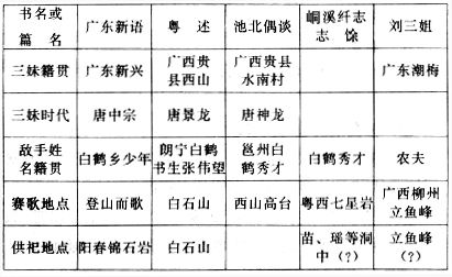新兴女子有刘三妹者,相传为始造歌之人。唐中宗年间,年十二,淹通经史,善为歌。千里内闻歌名而来者,或一日,或二三日,卒不能酬和而去。三妹解音律,游戏得道。尝往来两粤溪峒间。诸蛮种类最繁,所过之处,咸解其语言。遇某种人,即依某种声音作歌与之唱和,某种人奉之为式。 尝与白鹤乡一少年,登山而歌,粤民及瑶僮诸种人围而观之,男女数十百层,咸以为仙。七日夜歌声不绝,俱化为石。土人因祀之于阳春锦石岩,岩高三十丈,林木丛蔚,老樟千章,蔽其半。岩口有石磴,苔花绣蚀,若鸟迹书。一石状如九曲,可容卧一人,黑润有光,三妹之遗迹也。月夕,辄闻笙鹤之声。岁丰熟,则仿佛有人登岩顶而歌。三妹今称“歌仙”。凡作歌者,毋论齐民与瑶僮人,山子等类,歌成必先供一本。祝者藏之,求歌者就而录焉,不得携出。暂积遂至数箧。兵后,今荡然矣。 (《广东新语》八) ![]() |